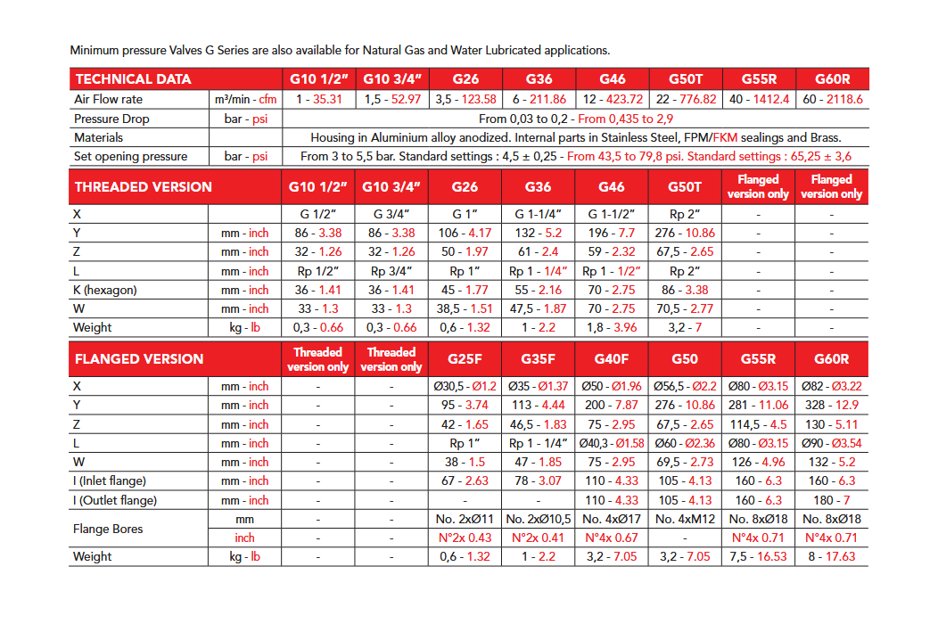 شیرهای این خانواده در سایزهای مختلف از G10 ½″ تا G60R عرضه میشوند. هر مدل برای ظرفیت مشخص طراحی شده: